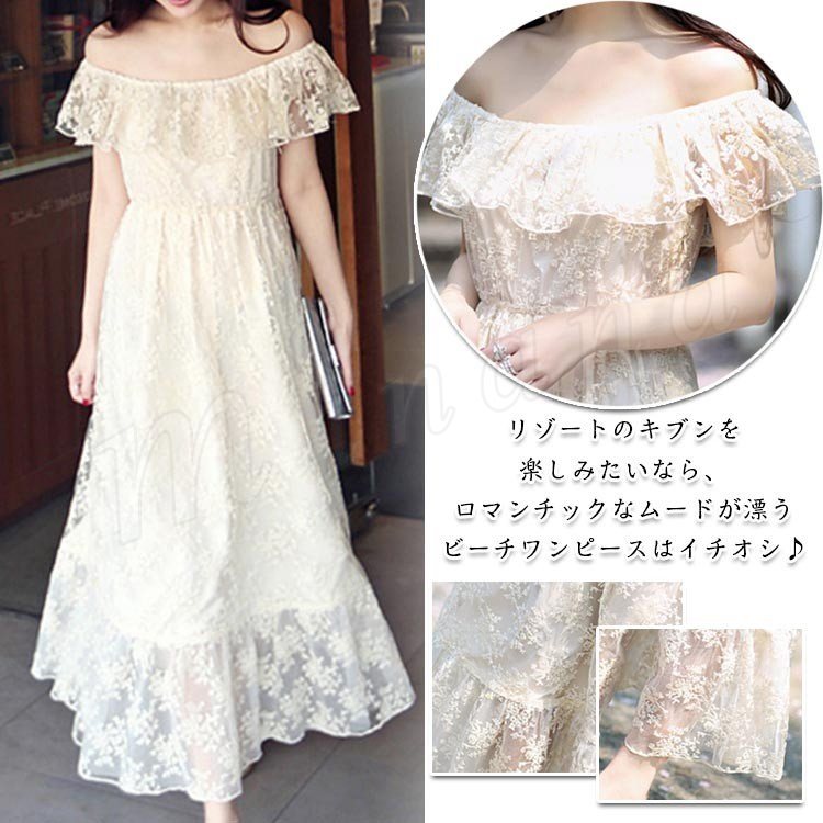 マキシワンピ 夏 リゾート ビーチ レース 胸元フレア オフショルダー 無地 aライン ロング マキシ丈ワンピース パーティードレスとしてもo