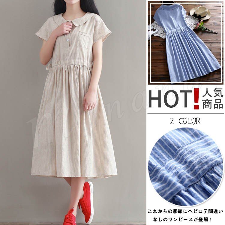 春ワンピ スキッパーワンピ シャツワンピ フレアワンピ レディース マキシ丈 半袖 ウエスト紐 ストライプ柄 爽やか ゆったり 2018春新作