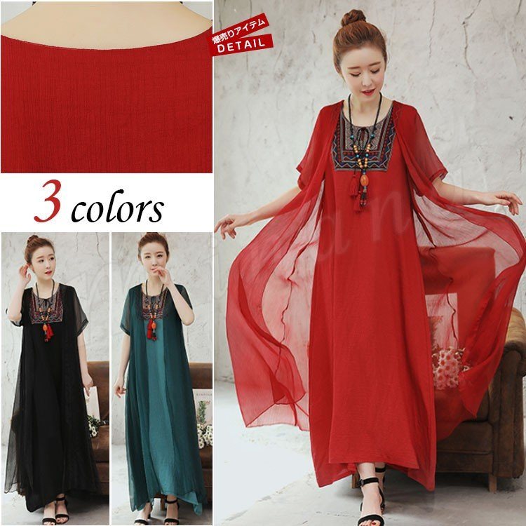 2018夏新作 チャイナドレス風ワンピース レディース 半袖 綿麻 ロング丈 マキシ丈 刺繍 中国風 偽2点 エレガント 体型カバー きれいめ おしゃ