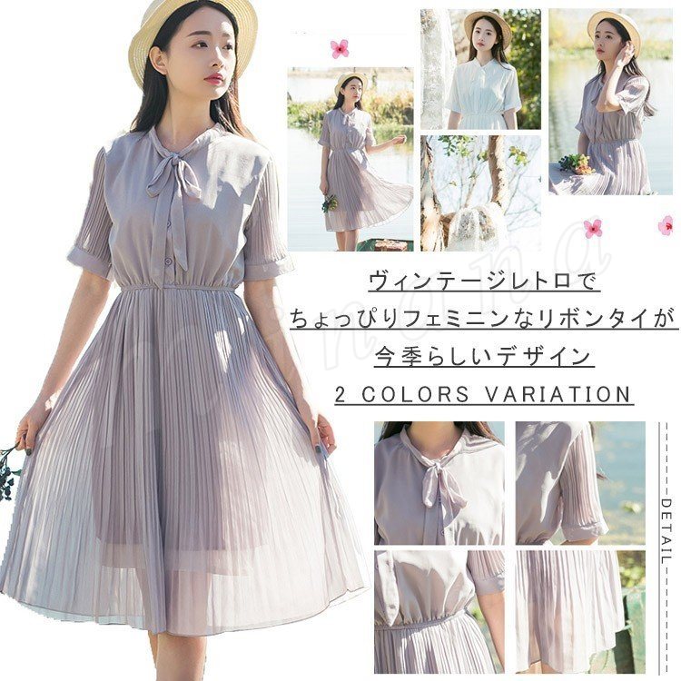 ボウタイ付き ワンピース リボンタイ シフォン ワンピース プリーツワンピース 森ガール ロングワンピース フレアワンピース シフォン ワンピ