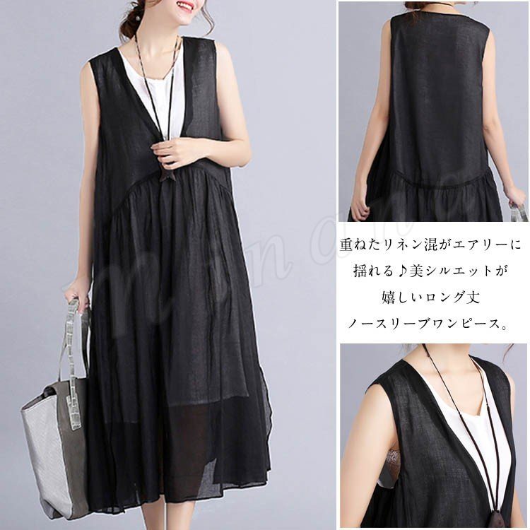 レディース ワンピース ノースリーブ Vネック スリット フェイク2点セット マタニティ フレアワンピ Aライン ロング丈 ブラック フリーサイズ