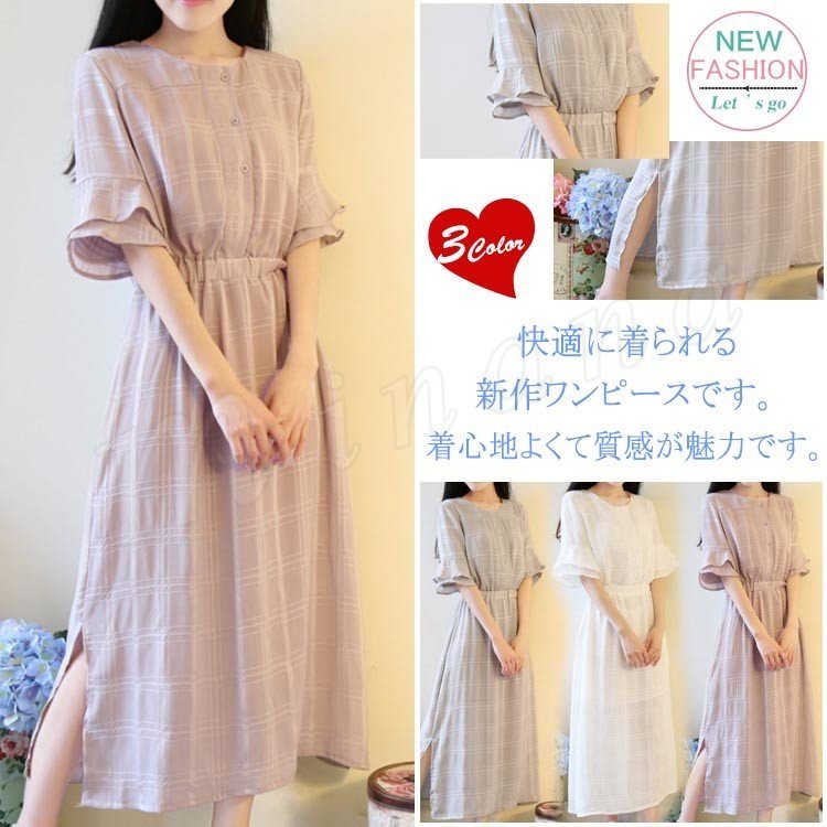 マキシワンピースチェック柄スリットレディース森ガールチュニックワンピースマキシ丈ロングシフォン半袖ワンピースキレイめ夏新作