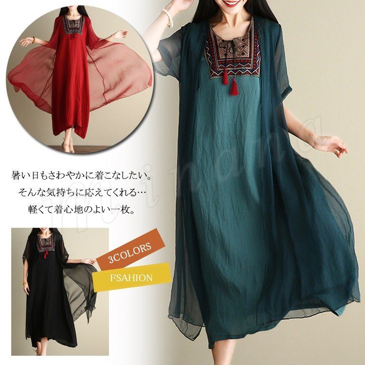この季節になると恋しくなる素材感。綿麻素材 マキシ丈ワンピース ワンピース 綿麻 リネン ワンピース 麻 エスニック刺繍 ロングワンピース Z