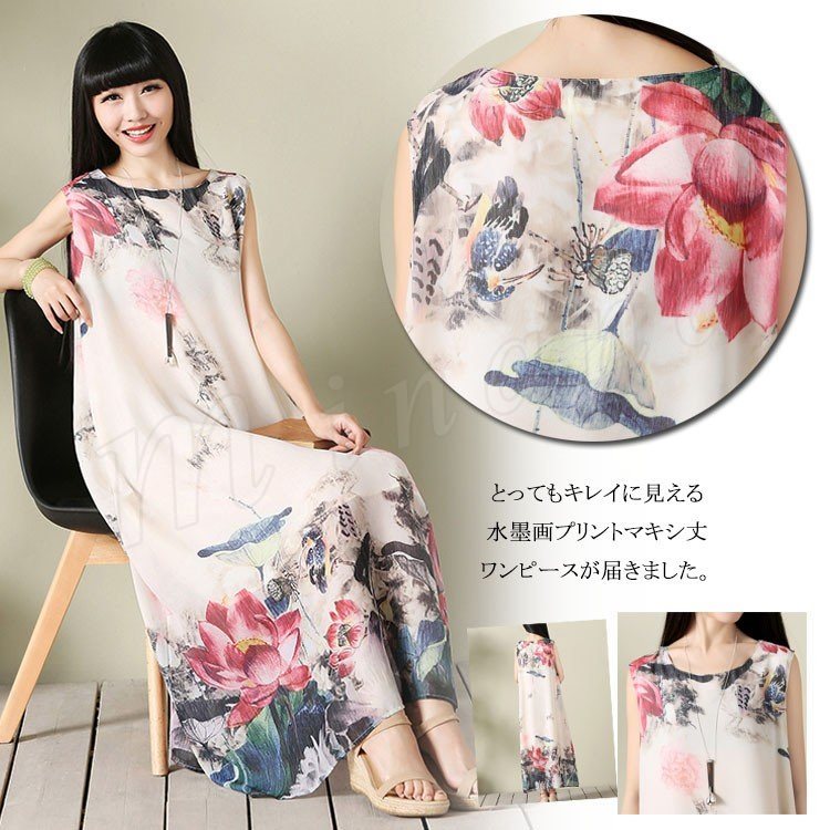 蓮柄ワンピース マキシ丈ノースリーブワンピース ワンピース マキシ丈 ロングワンピース 水墨画柄 プリント 花柄 ノースリーブ ゆったり ナチ