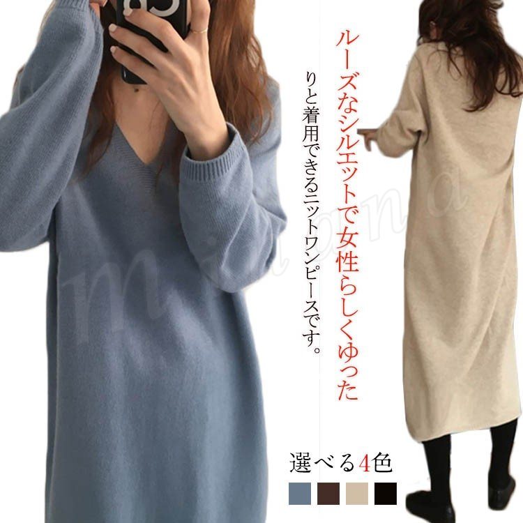 Vネック ニットワンピース ミモレ丈 ロング丈 ニット ワンピース レディース ニットワンピース ニット ベーシック ゆったり
