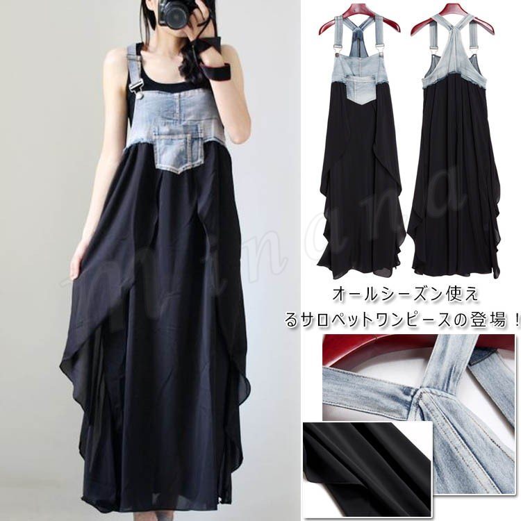 マキシ丈ワンピース サロペット ワンピース シフォン 切り替え ワンピース マキシワンピ ノースリーブ ワンピース サロペット デニム切り替えワンピース