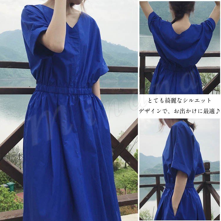 レディース ワンピース 半袖 Vネック マキシ丈 Aライン ロングワンピース フレアスカート フリル シンプル ウエストゴム 着やせ ブルー フリーサ