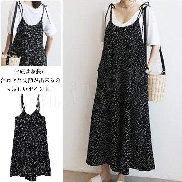 レディース オールインワン ワイドパンツ ドット柄 水玉キャミソール サロペット マキシ ガウチョパンツ シフォン ゆったり ロング丈 フリーサイズ