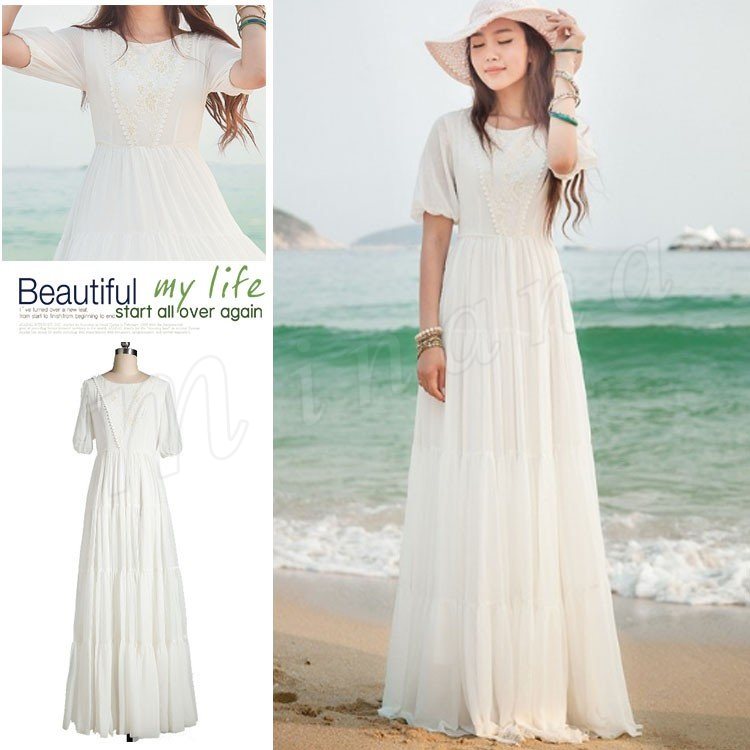 ビーチワンピース ハワイ レース 花柄刺繍 白 無地 ロマンチック ロング ミモレ丈 ノースリーブ ハイウエスト aライン 春夏 レディース