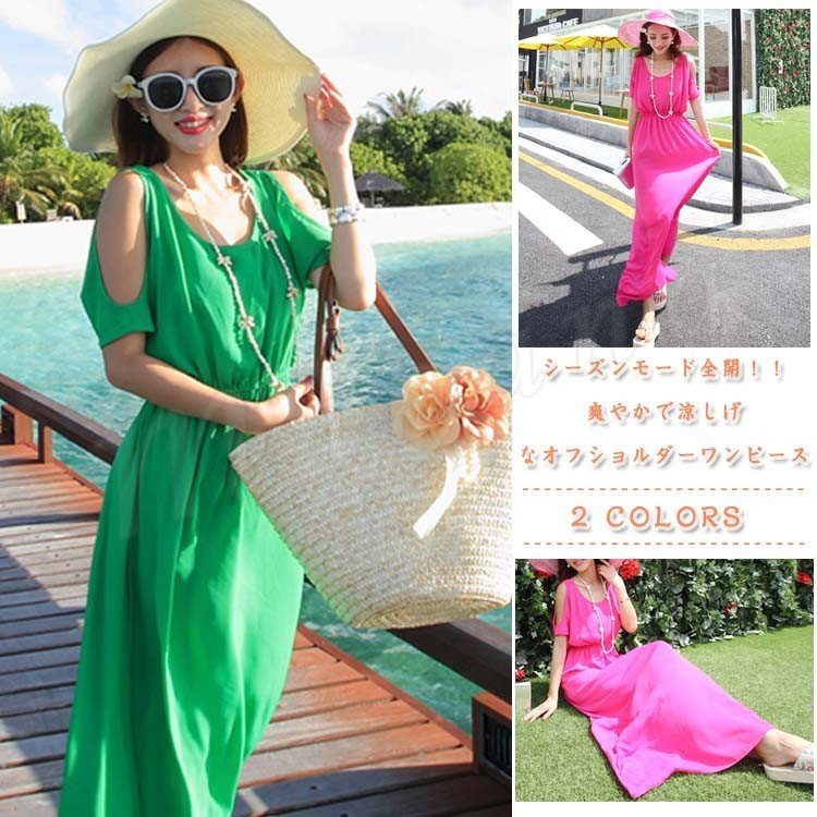 リゾートワンピース ロングワンピース オフショルダーワンピ レディース 半袖 Uネック ウエストゴム エスニック調 ボヘミアン