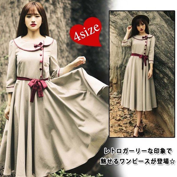 ロング丈フレアワンピース長袖マキシワンピースお嬢様ワンピフレアワンピース9分袖レディースレトロリボンAラインハイウエスト