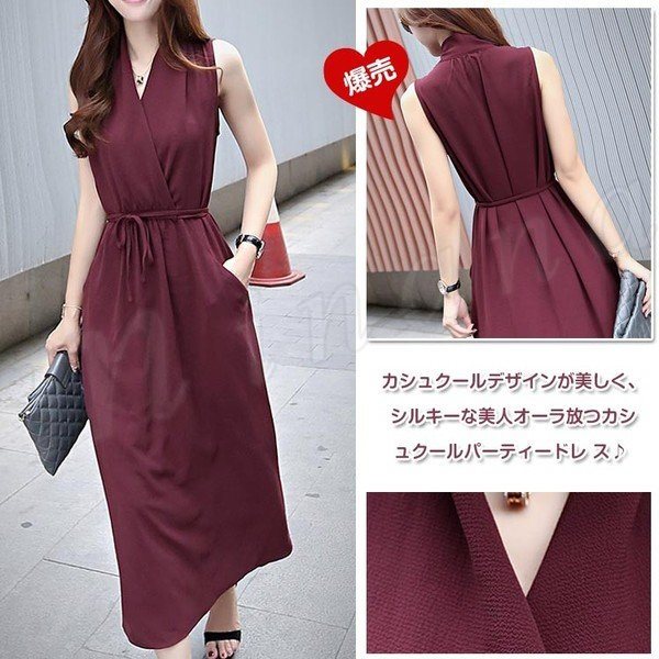 マキシノースリーブワンピースVネックカシュクールワンピースナチュラ風ワンピースシフォンワンピ森ガール系袖なしワンピースリゾート