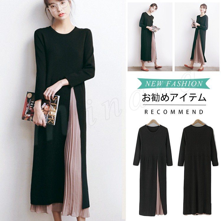 サイドシフォン 切替 ニットワンピース ロング サイドプリーツ切替ワンピース サイドプリーツ ニットワンピース サイドシフォン切替ニットワンピ