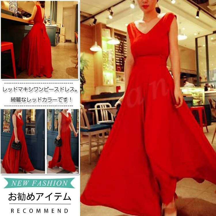 美背 深Vネック 艶 レッド ワンピース 夏 リゾート マキシ丈ワンピース 結婚式 二次会 ドレス リゾートワンピース レディース