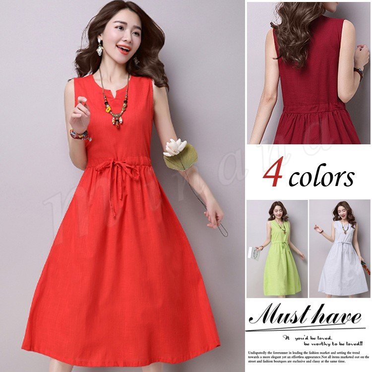 ワンピース夏ワンピレディース麻綿ノースリーブリネンリネンコットンレイヤード重ね風刺繍柄レイヤード