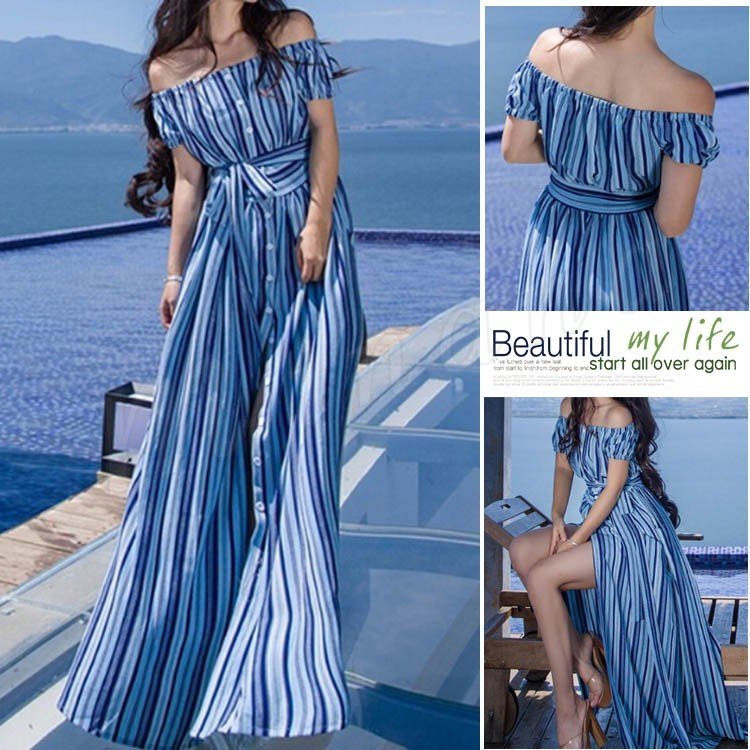 マキシワンピ 一枚で気楽 夏 半袖/ノースリーブ マキシワンピース ブルー マキシ丈