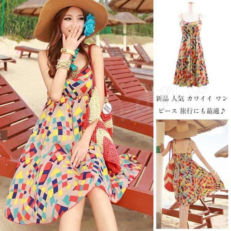 ワンピース レディース ワンピース 夏 フレアスカート 海ワンピ 棉 ボヘミア 大きいサイズ 海辺 ノースリーブ カラースクエア ショートワンピース