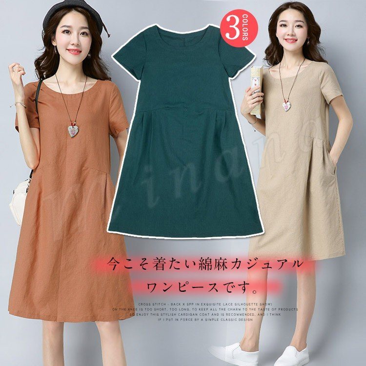 リネンワンピース レディース ワンピース 半袖 カジュアルワンピース リネン 綿麻 シンプル ゆったり ナチュラル コットンリネン