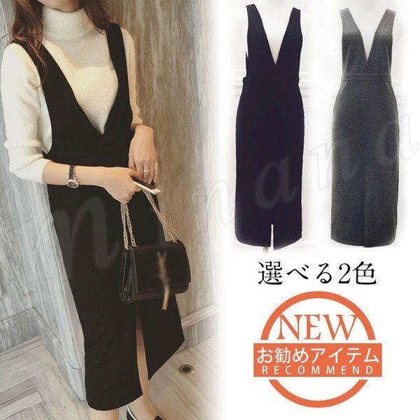 タック サロペット ワンピース ミディアム スカート Vネック スリット入り オールインワン メルトン サロペットワンピース レディース キ