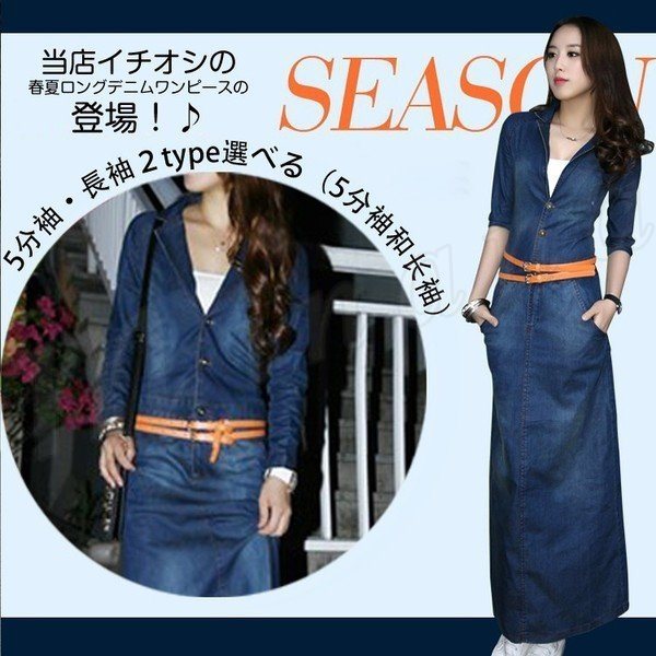ベルト付きデニムワンピース デニムワンピース マキシ丈 Aライン 長袖 ユーズド加工 ワンピース デニム 春ワンピース 秋ワンピース 5分袖 ZOKO