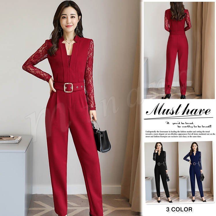 レディース オールインワン パンツドレス 長袖 レース付き 春秋 パーティードレス オーバーオール Vネック 通勤 入園式 結婚式 二次会 お洒落