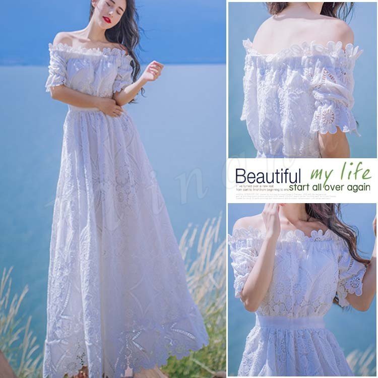 2018新作 レディースロングワンピース オフショルダー 森ガール 旅行/海/ビーチ/撮影/舞台/パーティー 透かし彫り