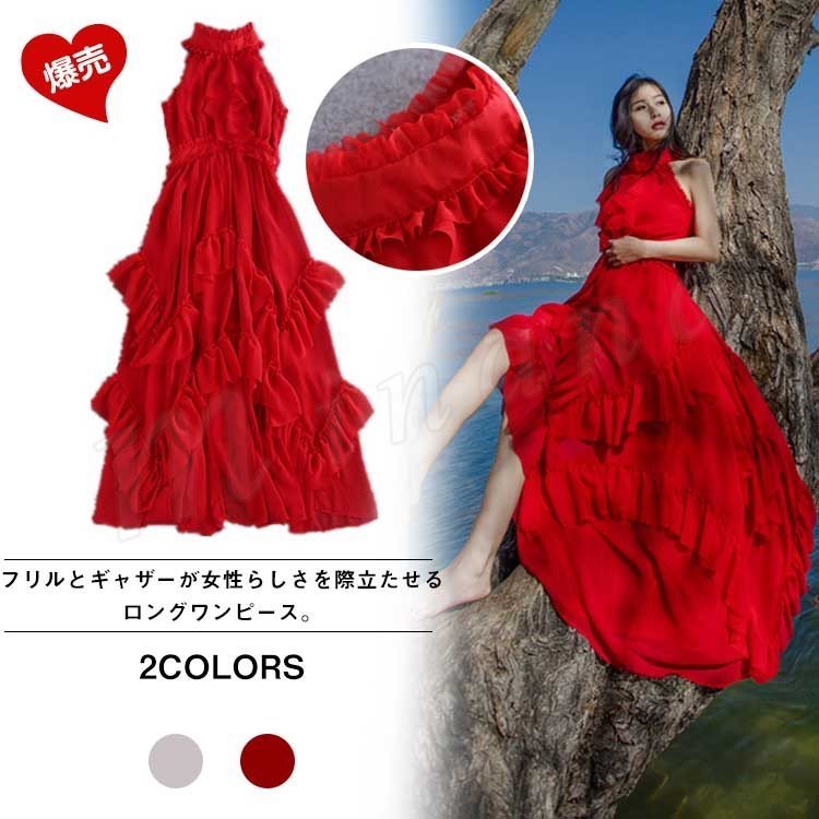 マキシワンピースワンピースロングワンピースシフォンワンピースレディースノースリーブ夏ワンピースバックレスセクシークルーネック海外旅
