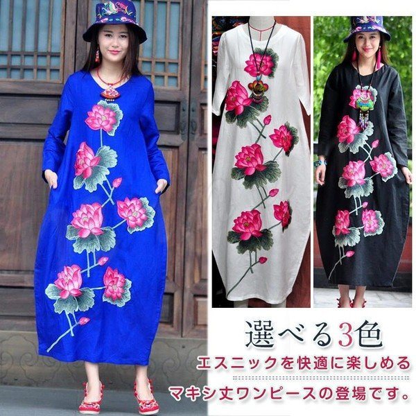 半袖マキシワンピースマキシ丈ワンピースマキシワンピエスニック蓮刺繍カジュアルリゾートワンピ大きいサイズ