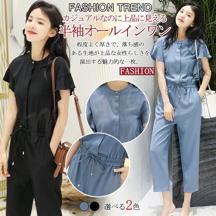 半袖オールインワン レディース オールインワン フリル袖 パンツドレス コンビネゾン オーバーオール 半袖 九分丈 ブラウジング カジュアル