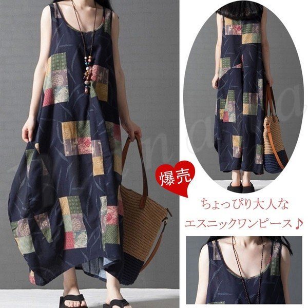 ロング綿麻ワンピースノースリーブワンピース民族風ワンピースタンクワンピースエスニックワンピース大きいサイズリネン2017夏新作