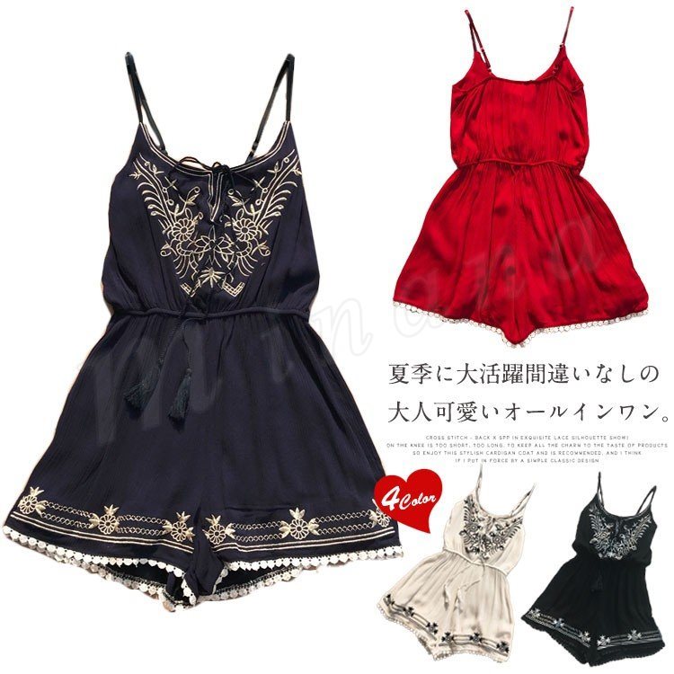 ロンパース オールインワン サロペット ショートパンツ エスニック刺繍 キャミ 花柄 ビーチウエア ハワイ ビーチ リゾート カジュアル