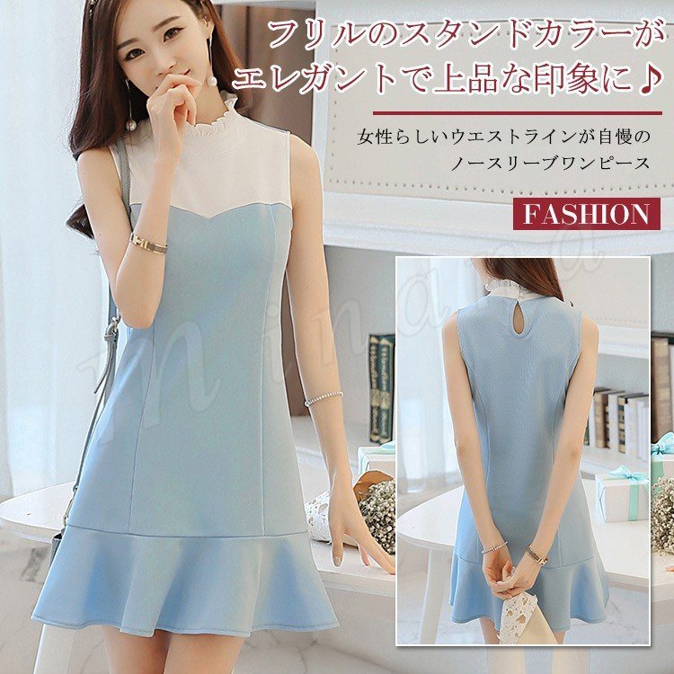 レディース 2018春夏 ワンピース フリルワンピース フリルネック フレアワンピース ニット 夏ワンピ 切り替え 無地 袖なし ノースリー