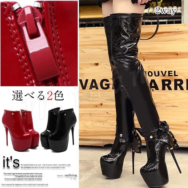 シンプルなデザインの細身 エナメル ニーハイブーツ 2way 黒 赤 のカラー2色 大きいサイズ ピンヒール ブラック レッド レディース コ