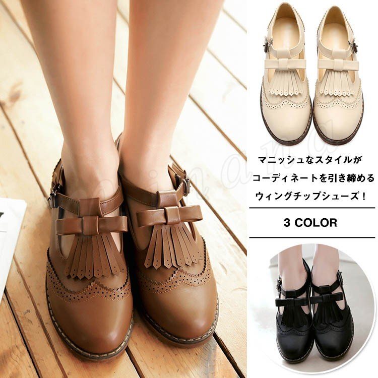 フリンジパンプス フラットシューズ ストラップシューズ ウィングチップシューズ 靴 レディース ヴィンテージ レトロシューズ 歩きやすい