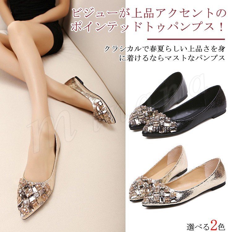 ポインテッドトゥ パンプス レディース ビジュー パンプス キラキラ 痛くない ぺたんこ ぺたんこ靴 フラットパンプス フラットシューズ