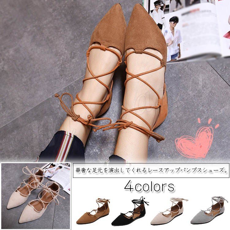 パンプス フラット 紐 編み上げ サンダル レースアップサンダル レディース ローヒール ポインテッドトゥレースアップパンプス