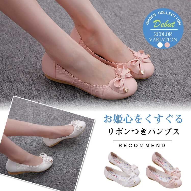パンプス ラウンドトゥ サイドリボン付き フラットシューズ ラウンドトゥパンプス レディースシューズ シューズ 靴 ぺたんこ ぺたんこ靴 レザーパンプ