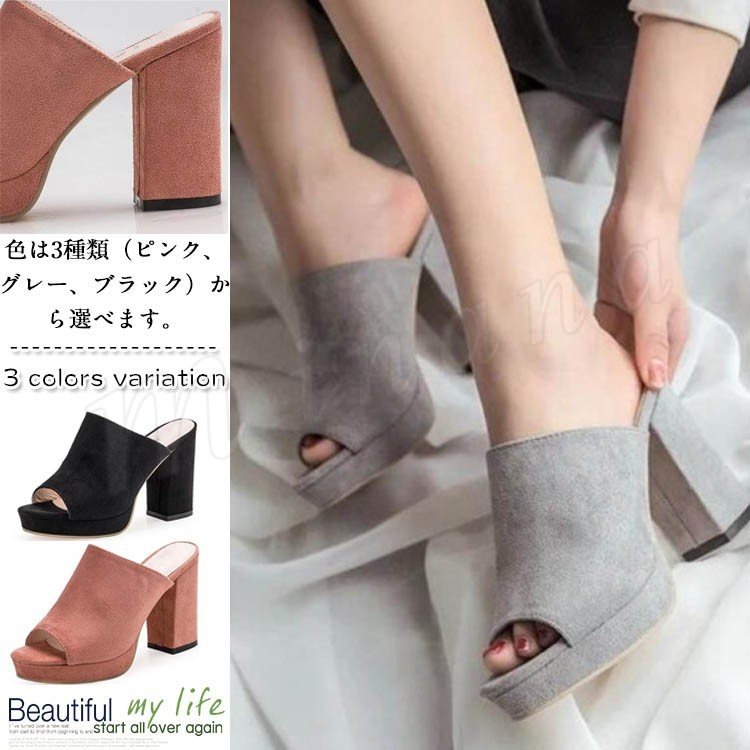 レディース 靴 サンダル ミュール 太めヒール オープントゥ ハイヒール 厚底パンプス ジップ 美脚 大人 春 2018春新作