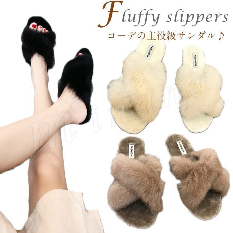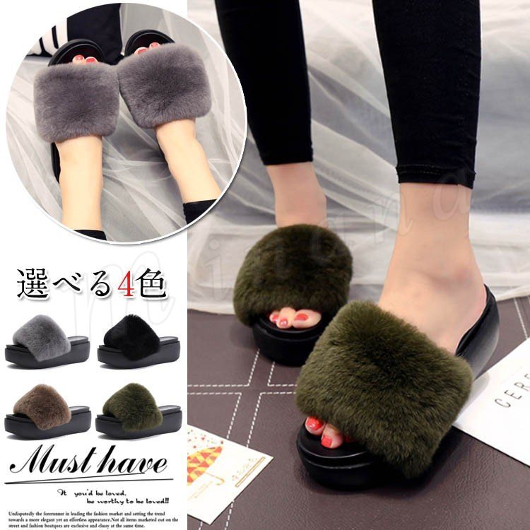 秋物新作 今季トレンドファーサンダル? 厚底 厚底サンダル フラット スポサン レディース 小さいサイズ 秋サンダル ファー ファー付 ラビットファー